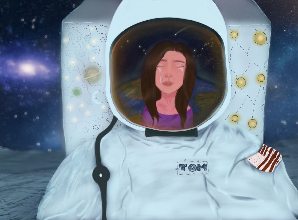 She stands on the edge of Earth, beneath the endless sky, her eyes closed, tears quietly falling. She doesn’t cry because he’s gone—she cries because she still feels him. Because she’s still waiting. Her heart never left orbit.