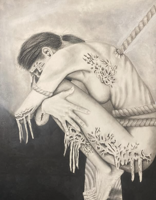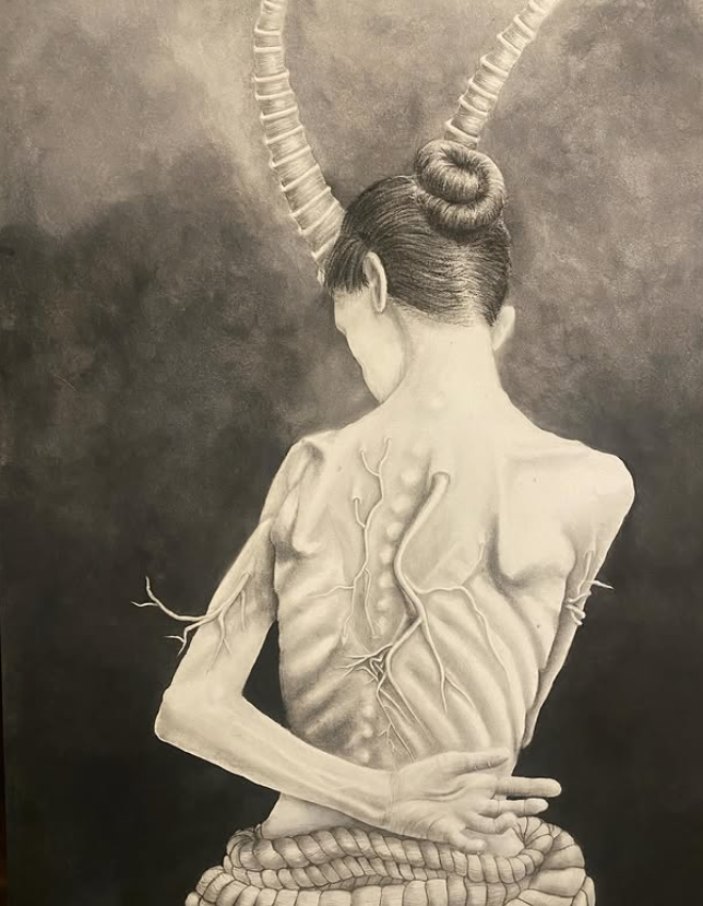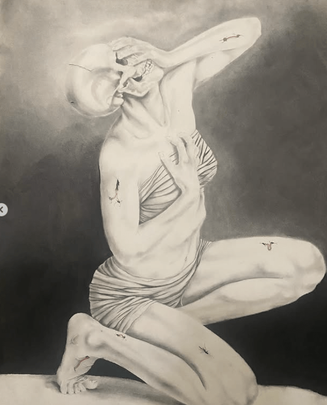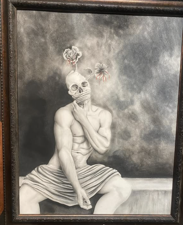 In recent times, he has begun implementing the use of color into his typical monochromatic work, an emblematic shift toward an enlightening perspective. Where shadow once was the main focal point, now emerges soft hues: violets, blues, yellows, and greens. All blooming like unspoken triumphs. His newest commissioned piece, “Nature, Nurture, Emmy” Mark dives into the duality of nature and the first thoughts in my mind were “How can one piece be both brutal and elegant at the same time?” The woman caught in between decay and bloom, it reflects the very tension one might feel. With brains cracked open, flowers stretching from limbs, and a skeletal face that’s not only about death, but recognizing the transformation. In the caption of this piece, Mark touched on his feelings during the process of creating this, “This was a challenge, but I enjoyed every part of this creation.” And trust me when I tell you this, Mark, the joy shows—not in the traditional sense of happiness—but in the depth of thought, in your commitment to creating work that speaks to more than just beauty. It reigns truth.